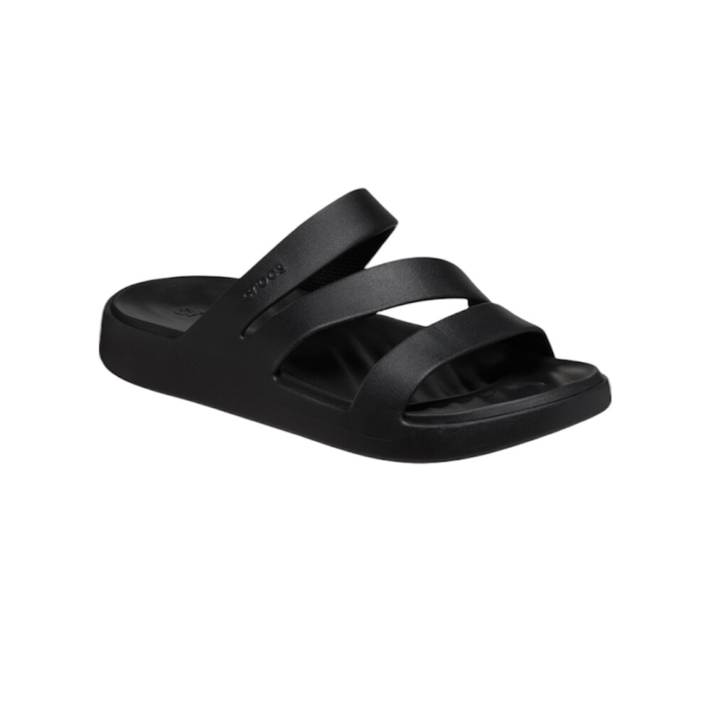 Svarta badtofflor Getaway Strappy Black från Crocs. Klassiska slip in tofflor tillverkade i mjukt Croslite material för ökad komfort och stötdämpning. Vågig innersula med en konturerad logga i hälen. Klackhöjd på ca 3.5 cm, yttersula med mönster för bra grepp på underlaget. Perfekta badtofflor för varma sommardagar på stranden eller vid poolen!