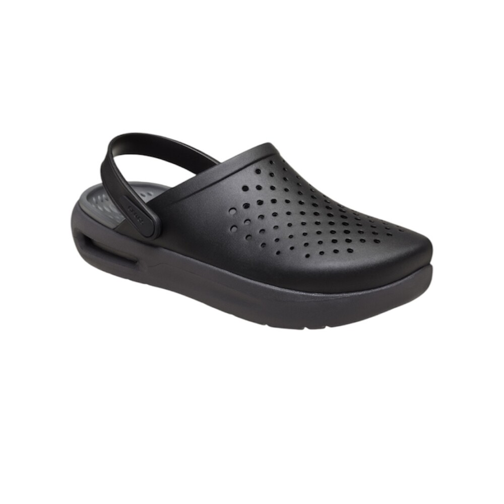 Svarta tofflor från Crocs tillverkade i mjukt Croslite material för ökad komfort och stötdämpning. Lufthål på ovandel och vid främre partiet. Rem som går att fälla upp och ned. Rund svart plastbit med vit logga som håller remmen på plats. Yttersula i Croslite med randigt mönster.