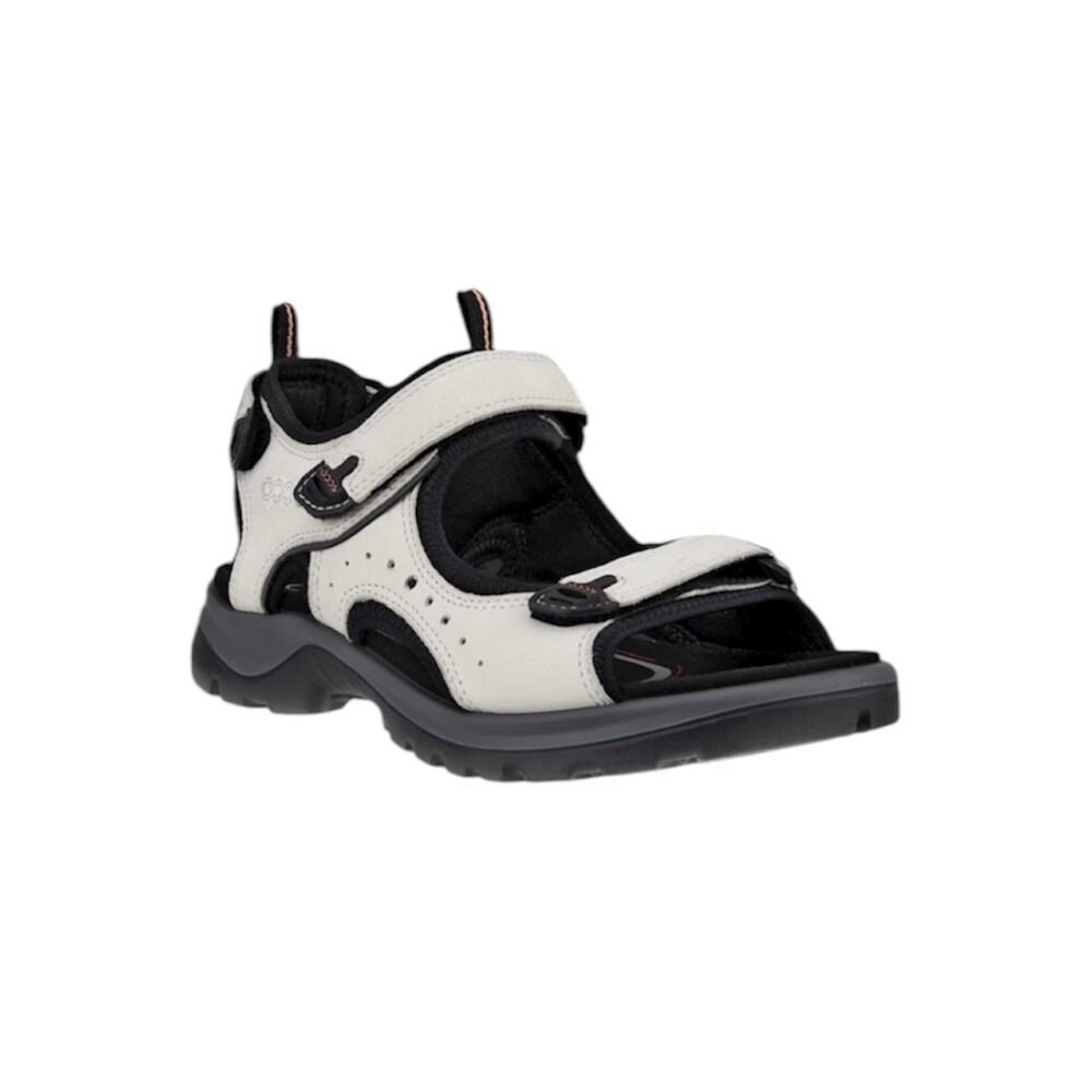 Ljus sandal från Ecco tillverkad i mjukt nubuckskinn. En lätt formgjuten yttersula som ger bra stabilitet samt dämpning. Två justerbara kardborrebandsremmar.