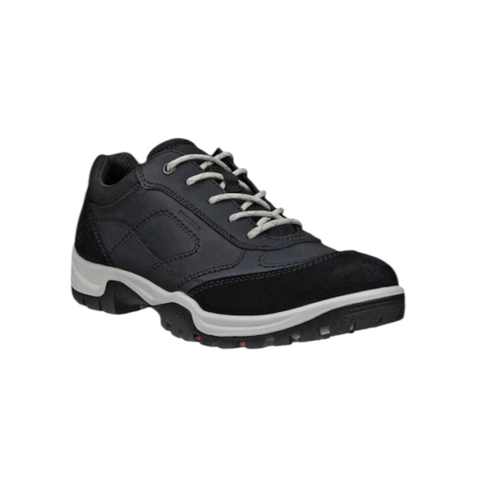 Svart promenadsko från Ecco tillverkad i skinn. Snörning framtill för att reglera till bra passform. Gore-Tex membran som gör att skon är 100% vattentät och samtidigt andas. Fotbädden är löstagbar och det funkar bra att lägga i sina egna inläggssulor. Kraftigt mönstrad yttersula för bra grepp året om.
