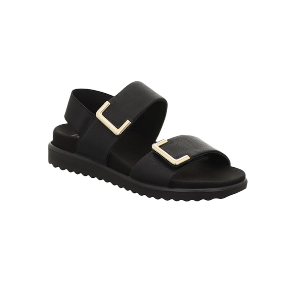 Svart sandal från Legero tillverkade i skinn. Två ställbara remmar för justering av rätt passform. Gjuten yttersula för riktigt skön komfort och fotbädd.