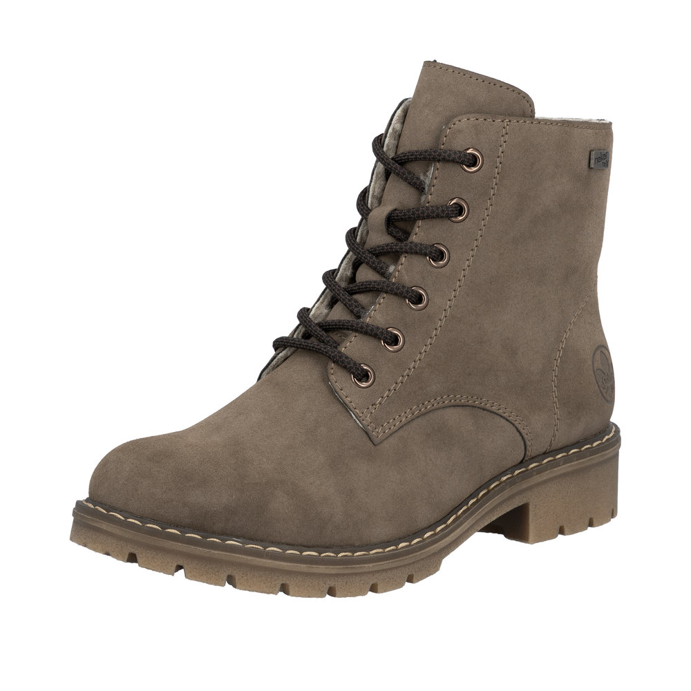 Mörkbruna snörkängor i skinnimitation från Rieker. Klassiska snörkängor med dragkedja vid insidan. Rieker-Tex för att tåla väta bättre. Foder i ullmix.