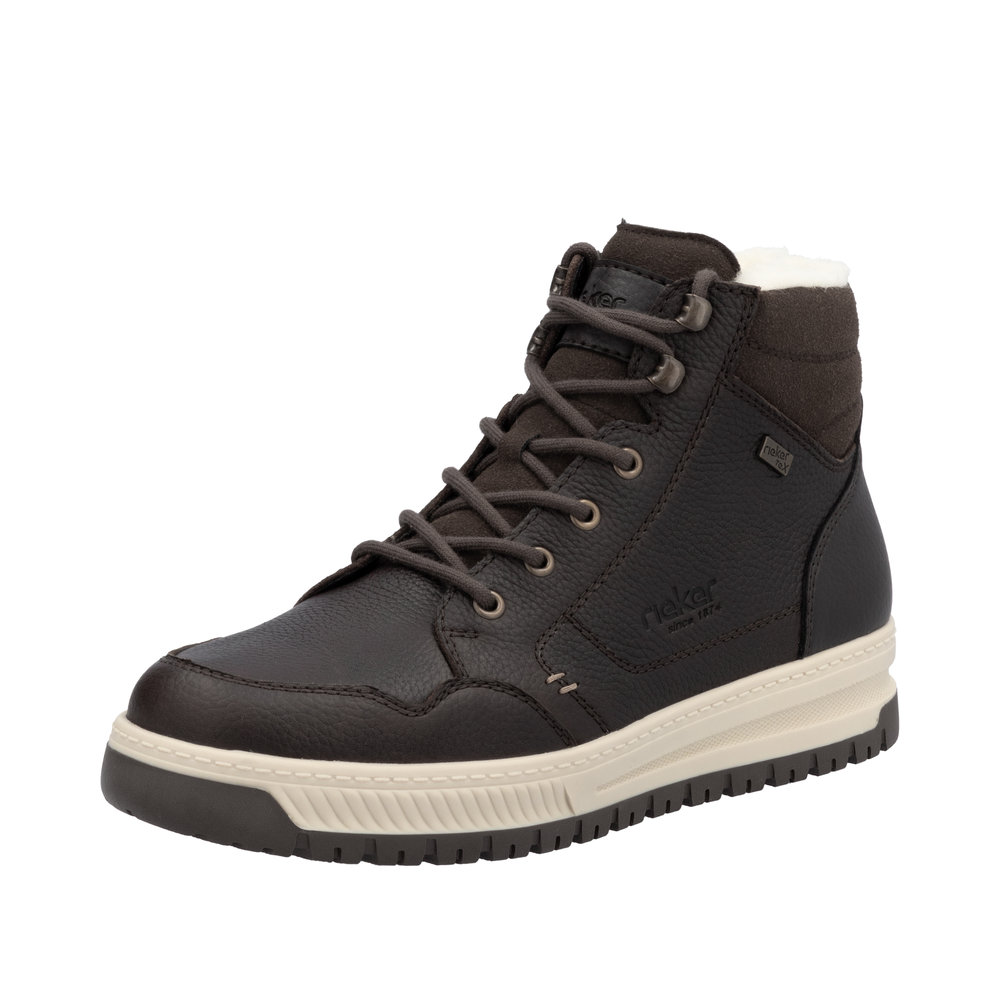 Mörkbrun vinterkänga från Rieker tillverkad i fettat skinn. Varmfodrad i ull med Rieker – Tex membran som gör att skån tål väta. Dragkedja på insidan av skon.
