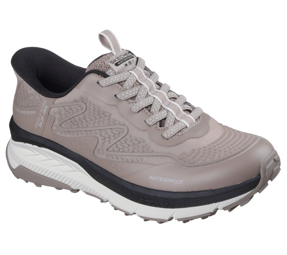 Ge dig ut på äventyr i naturen med komfort och stil i Skechers hands free slip-ins funktion. Enkel att kliva i och ur tack vare det inbyggda skohornet. Designad med exklusiv heel pillow har denna trailsko en monomesh- och syntetisk ovandel, elastiska snören och en vadderad Skechers air-cooled memory foam-innersula. Ett vattentät membran som gör att skon tål regn och rusk.
